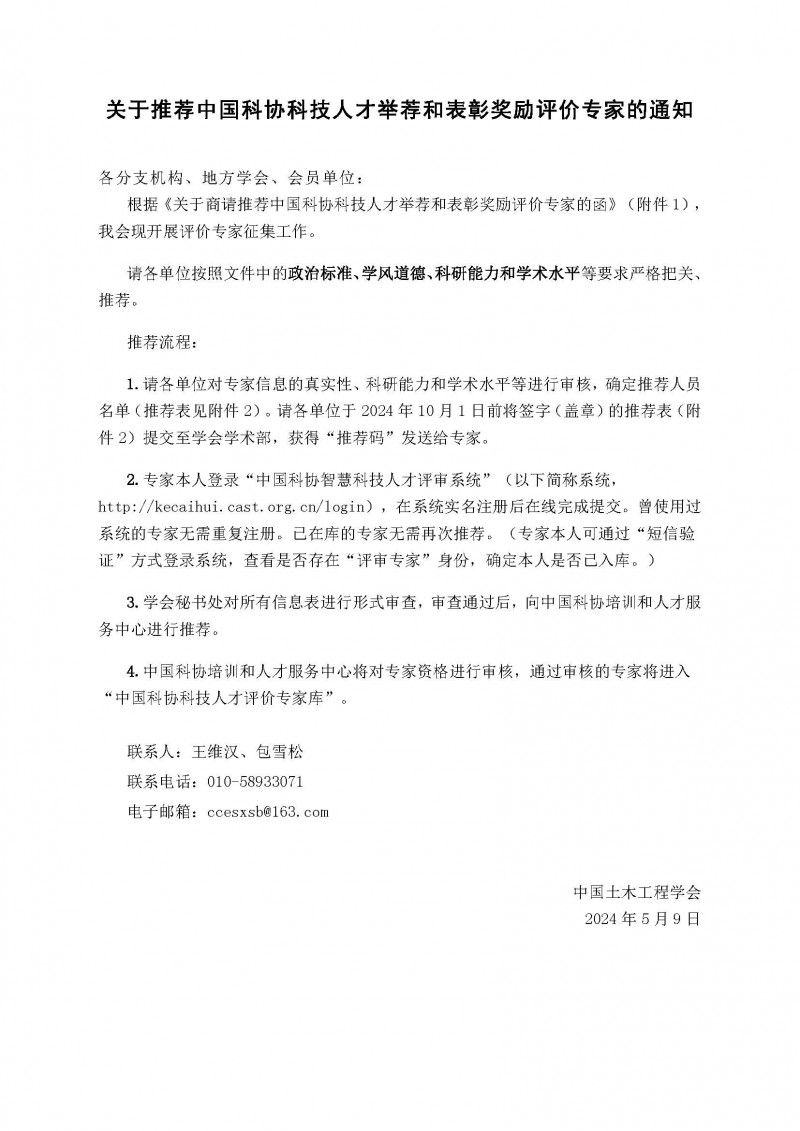 转发通知《关于推荐中国科协科技人才举荐和表彰奖励评价专家的通知》,有意愿申报的专家,按照《通知》要求,将电子版推荐表发送至学会邮箱:hbcas2007@163.com,联系人:王莹娜 电话:027-68873317。