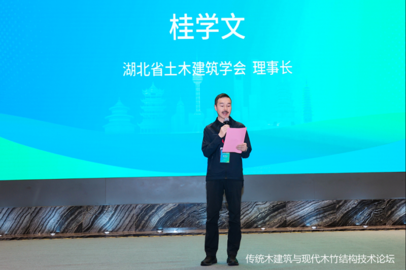 开幕式上,湖北省土木建筑学会理事长桂学文致辞时谈到,从武当山古建筑群的“九宫八观”巧夺天工,到荆州古城“榫卯相生”的千年屹立;从恩施吊脚楼“依山就势”的生态智慧,到汉派民居“雕梁画栋”的匠心独运,湖北的木构文化深深镌刻着“天人合一”的东方哲思。这些遗产不仅是历史的见证,更是现代木竹结构技术创新的灵感源泉。当前,全球建筑业正经历绿色化、工业化、智能化的深刻变革。现代木竹结构以其低碳环保、抗震节能、快速装配的优势,成为可持续发展的重要选择。湖北作为长江经济带核心省份,正积极探索木竹结构技术在城乡更新、文旅融合、乡村振兴等领域的应用,这些探索,既是对传统的致敬,更是对未来的担当。